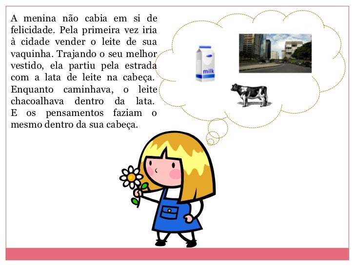 WebA Menina e o Leite - Turma Mirim. Uma menina se arruma para ir até a cidade vender o leite que tirou da sua vaquinha. WebA menina tinha tantos planos para o futuro que não tomou cuidado com seu balde de leite!Facebook - https://www.facebook.com/varaldehistoria-----... WebA MENINA E O LEITE A menina no cabia em si de tanta felicidade. Pela primeira vez iria cidade vender o leite de sua vaquinha. Trajando o melhor vestido, ela partiu pela estrada. WebA menina e o leite. Vivia numa aldeia uma família pobre. Certo dia, Susana, a filha mais velha, não cabia em si de felicidade, ela iria pela primeira vez à cidade.