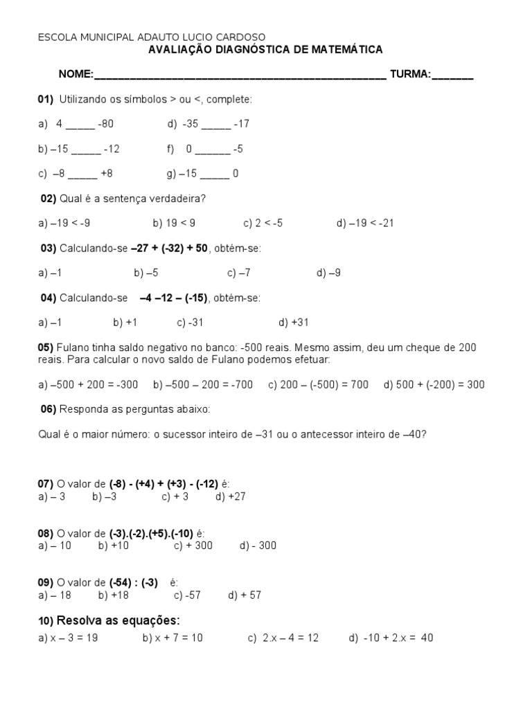 Avaliação Diagnóstica de Matemática 7º Ano | PDF popular