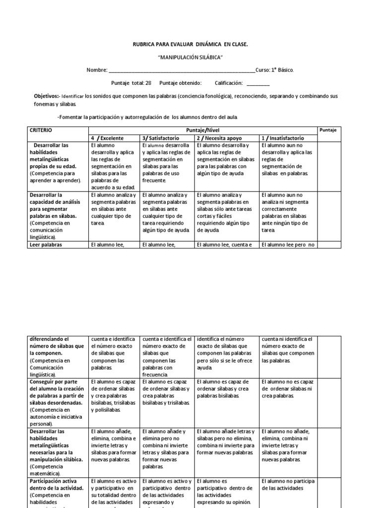Visualizar RUBRICA Conciencia fonologica | Sílaba | Fonología