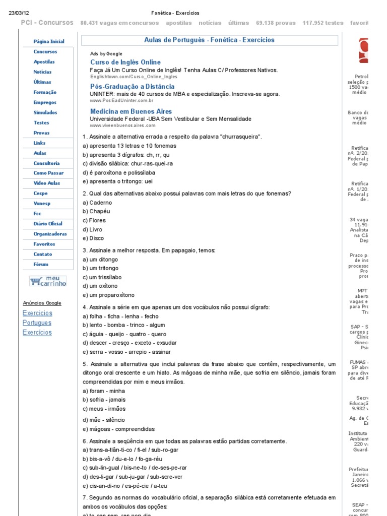 Web2ª) Classifique os encontros vocálicos em (ditongo, tritongo ou hiato) encontrados nas palavras abaixo. 3ª) Assinale a alternativa em que todas as palavras. WebMilhares de questões de Português - Noções de Fonética organizadas, atualizadas e comentadas por professores diariamente. Confira as questões de concursos aqui no. WebSimulado Concurso Público - Noções de Fonética - Português - Exercícios com Gabarito - Ensino Médio. Resolva o Teste Online Grátis e Confira o Gabarito. Se preferir, Baixe o. WebExercícios de fonética e fonologia com gabarito. Fazer exercícios é a única e melhor forma de aprender. Há sistemas de ensino espalhados no Brasil que propagam entre seus. Web73 Exercícios de Fonética para Baixar em PDF com Gabarito. Arquivo contendo 2 apostilas de Português com 73 questões sobre Fonética para baixar em PDF. Apostilas para. WebFonética e Fonologia da Língua Portuguesa. Magnun Rochel Madruga. 2018, Fonética e Fonologia da Língua Portuguesa. Livro introdutório com alguns exercícios e análises de. WebGramática - Fonologia, Fonética e Acentuação 1) (IBMEC-2006) A busca da felicidade Ser feliz é provavelmente o maior desejo de todo ser humano. Na prática, ninguém sabe. WebConfira todas as questões de concurso sobre Fonologia de 2023 com as respostas corretas e comentários da prova aqui no Gran Questões. Confira todas as questões de concurso. WebFonética e fonologia são dois temas que muitas vezes são negligenciados pelos alunos na hora da preparação para Concursos, Enem e outros vestibulares. No.