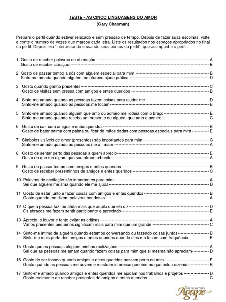 WebSign in. As Cinco Linguagens do Amor - Gary Chapman.pdf - Google Drive. Sign in WebAS CINCO LINGUAGENS DO AMOR TESTE 1- Gosto de receber bilhetes de carinho. Gosto de abraços. A E 11- Gosto quando fazemos coisas juntos. Gosto de ouvir.