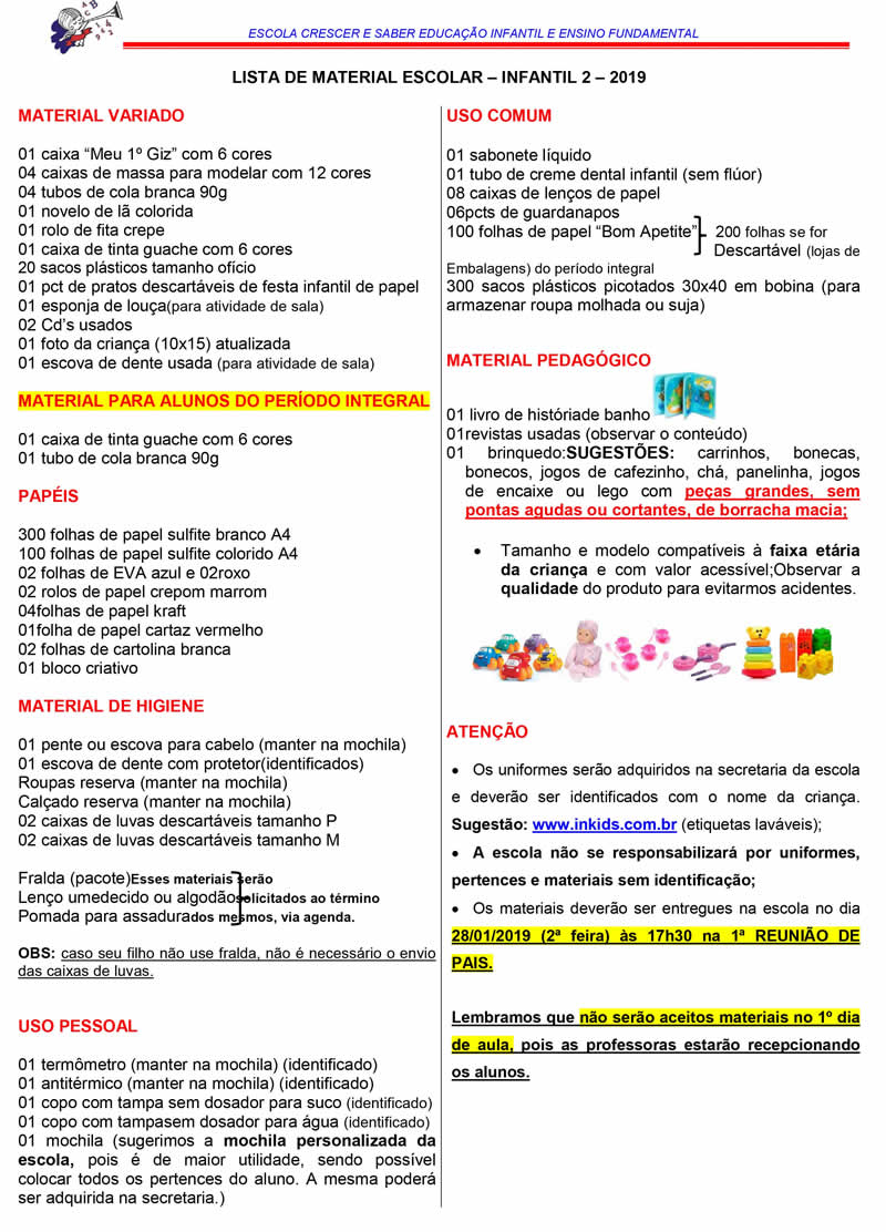 Artigos Lista de Materiais | Crescer e Saber - Escola de educação infantil em Último